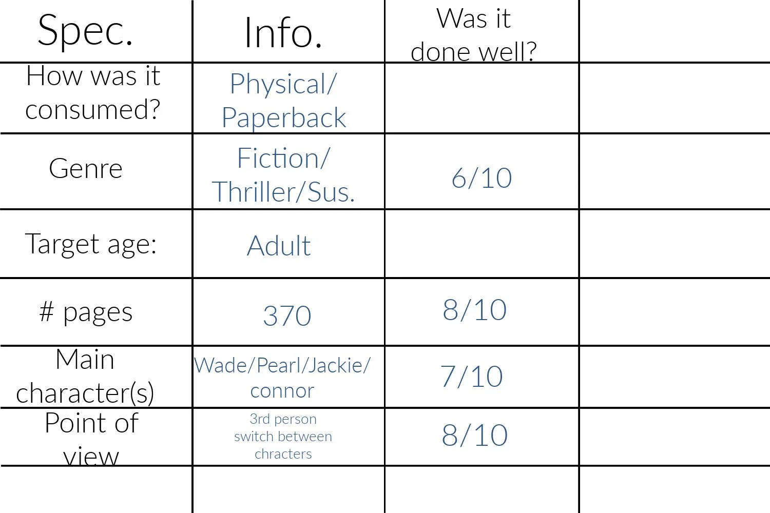 Favorite character: I had two. The first one was Connor because he was real, not that the others weren't but I felt his struggle more then most of the other characters. He was loyal but not naïve when so many other people mixed up in the craziness were, at the very least, in denial. Connor was young and ignorant at some times but he didn't ignore information in front of him and the fought with the information.